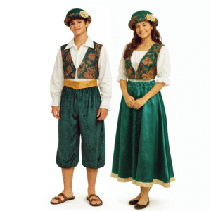 Earthy jewel tones and classic silhouettes make this green ensemble a versatile choice for palace scenes, market crowds, and royal attendants in Aladdin or Arabian Nights productions. Designed with coordinated male and female versions, these pieces mix seamlessly with other townspeople colors for a cohesive stage look.