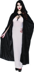 A classic look for witches, vampires, and mysterious ladies of the night. This long black cape is made from soft crushed velvet that shimmers under candlelight and moonlight alike. It features an attached hood and black ribbon ties at the neck for a secure, dramatic drape. Perfect for completing gothic, fantasy, or Halloween looks with timeless elegance.